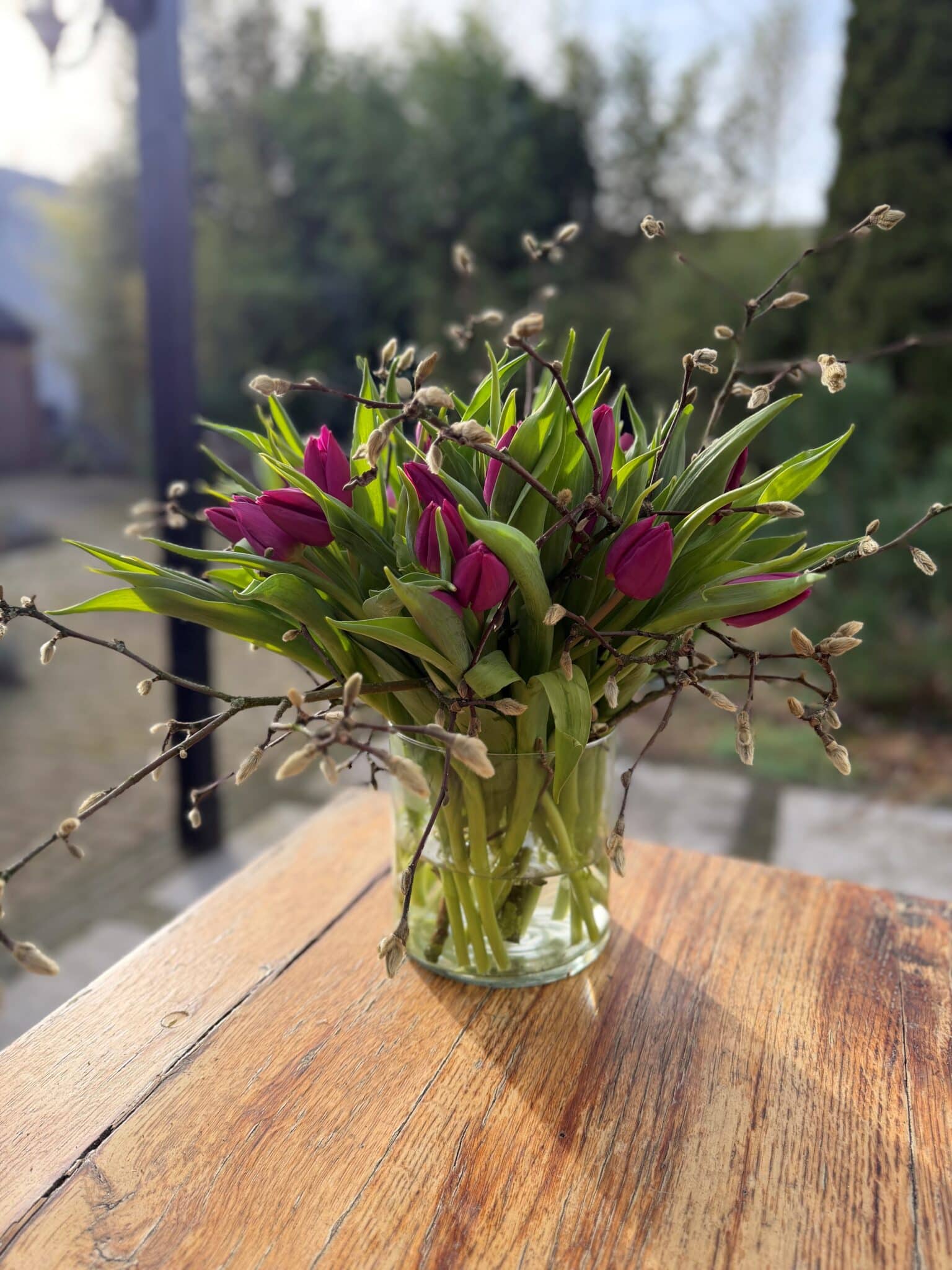 Glasvaasje met Hollandse tulpen lekker aangekleed met groen