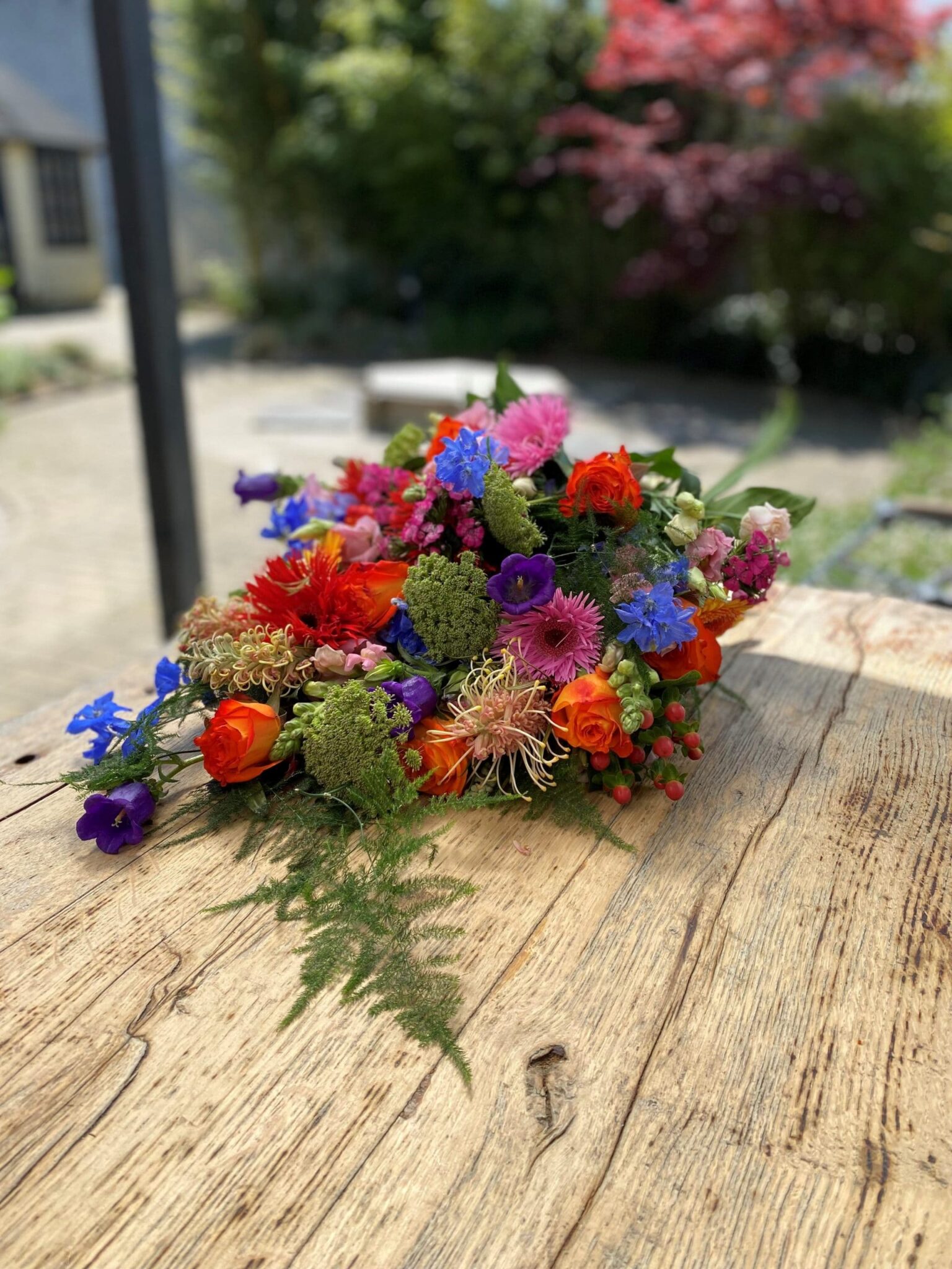 Het is een boeket wat gemaakt is om neer te leggen, de speciale vorm zorgt ervoor dat het op deze manier het beste uitkomt.
