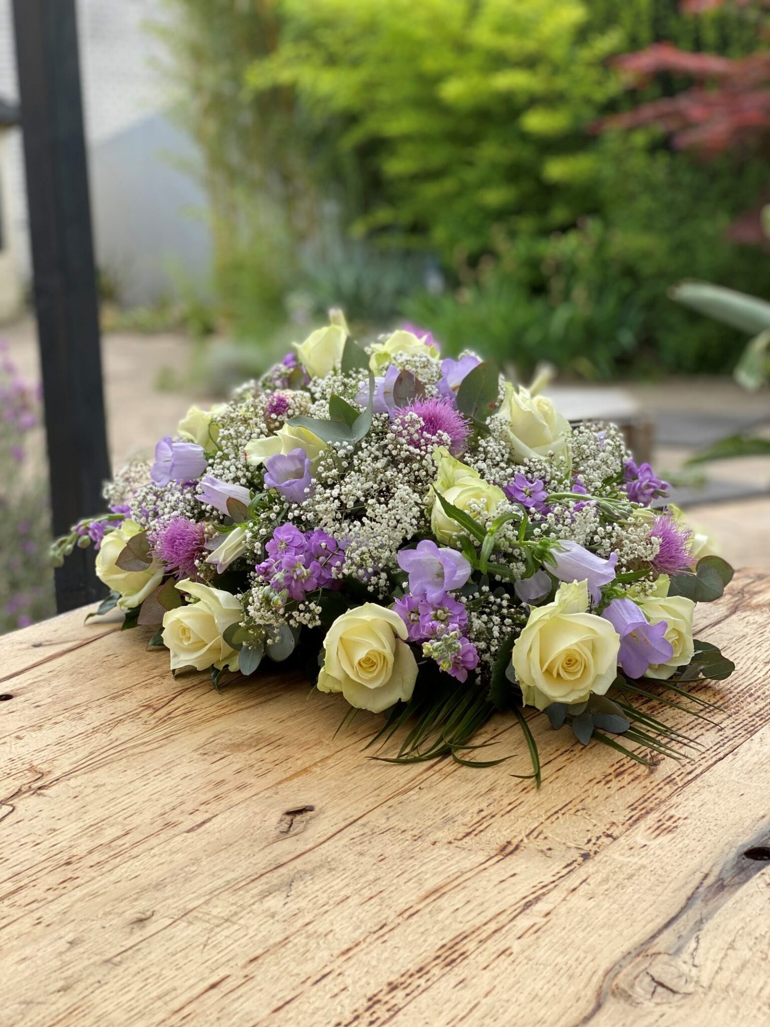 Dit rouwarrangement heeft zachte kleuren in oase gestoken in druppelvorm met een lengte van 60 cm