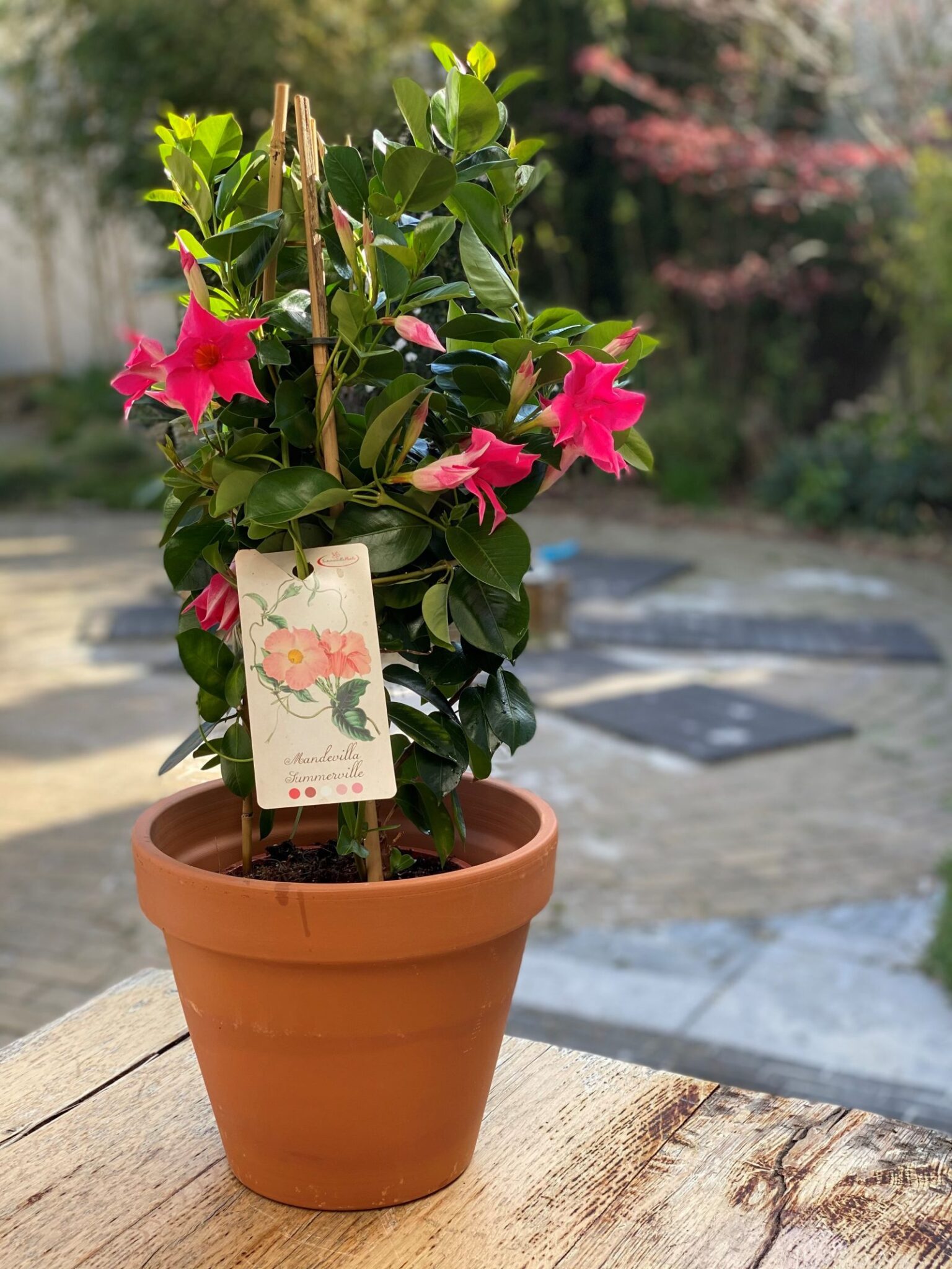 Terrasplanten Mandevilla in roodstenen overpot