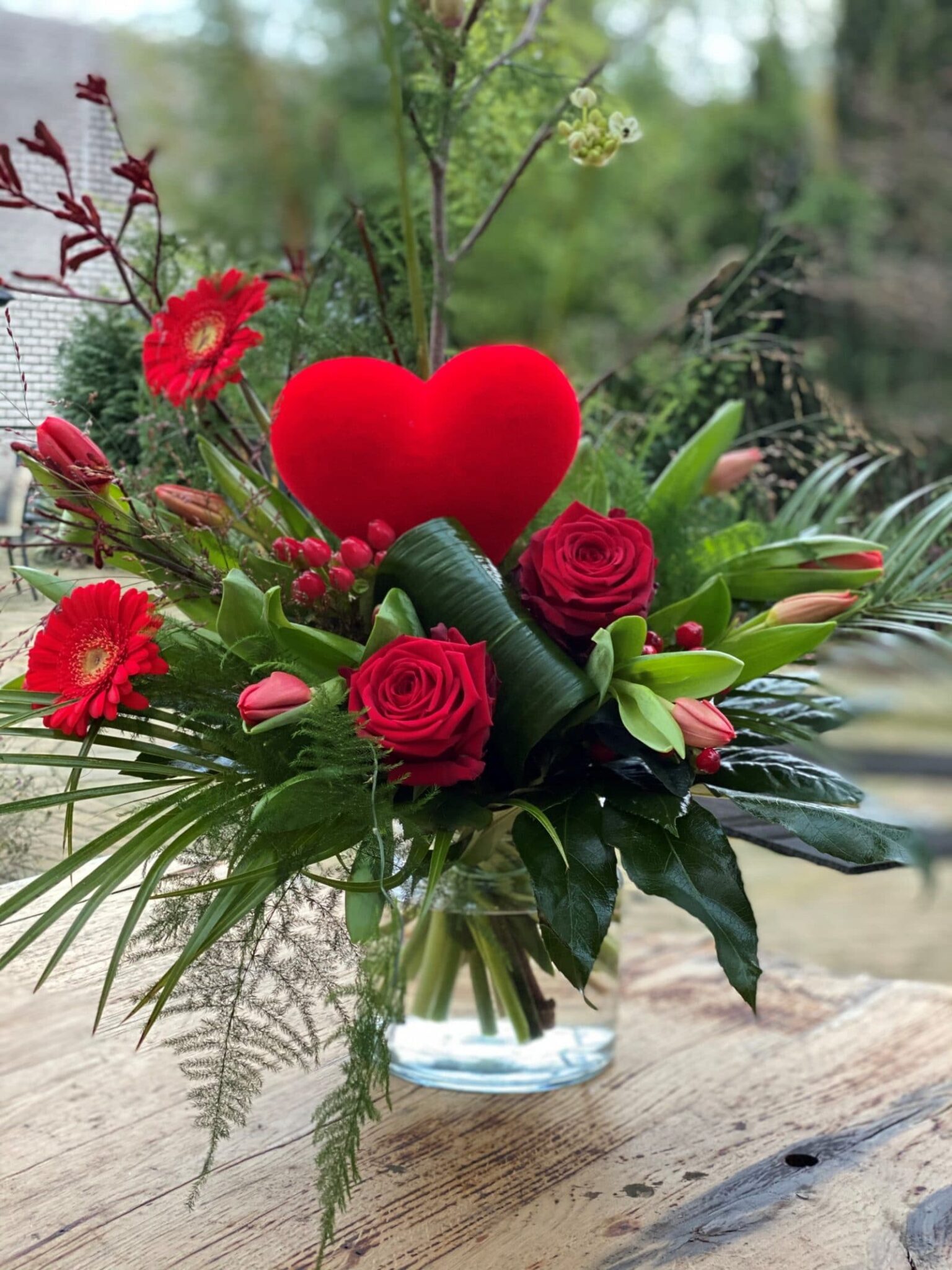 boeket met groot hart en rode rozen